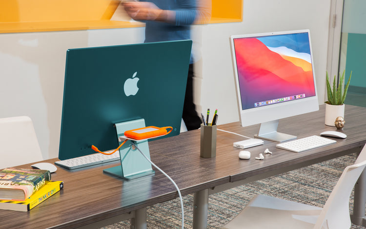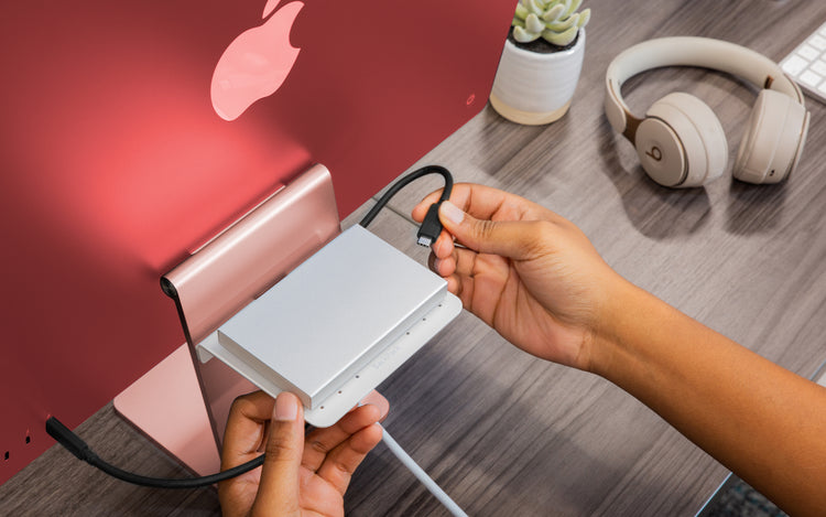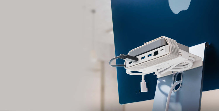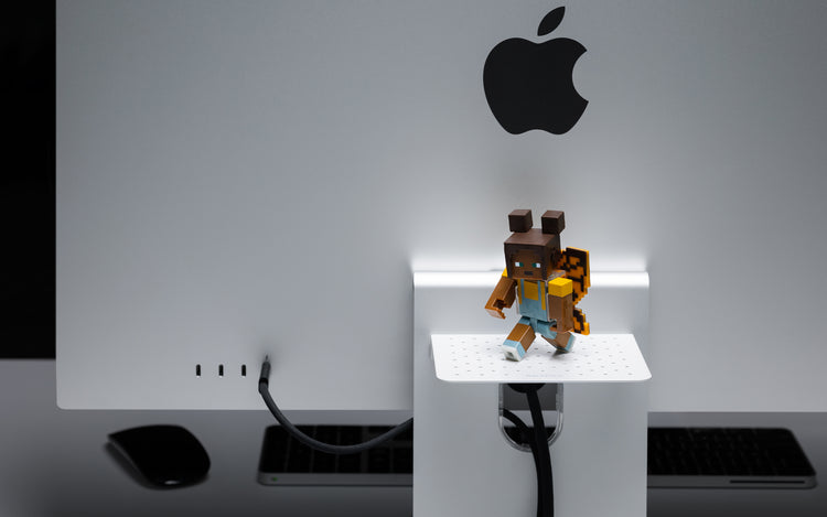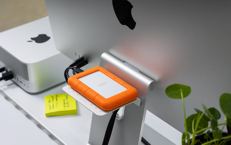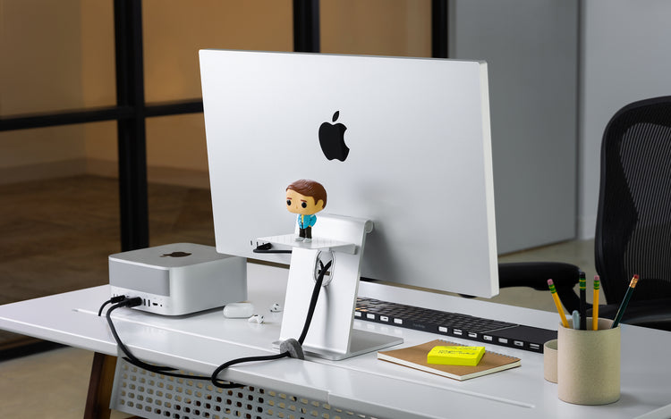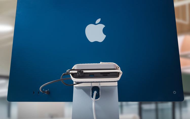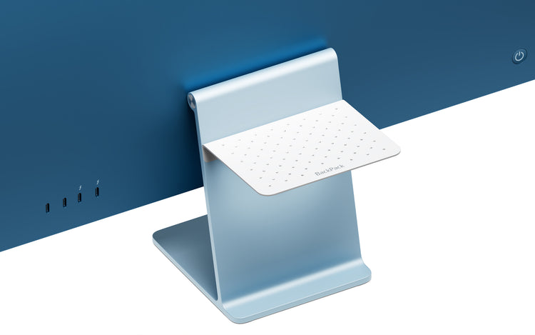 BackPack is a snap to install. Literally. A two-piece holster snaps into the oval opening on the back of your iMac or Studio Display stand. Then you slide the stand onto the holster. That’s it. So easy. By the way, the holster is clear, so the color of your iMac shows through. Spruce up your Mac workspace. Order your BackPack today.